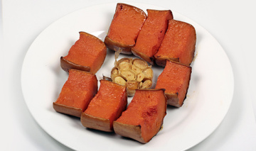 Couper la citrouille en gros morceaux et les placer sur une plaque de cuisson avec l'ail coupé en deux. Faire cuire pendant environ 40 minutes à 200 degrés jusqu'à ce que la citrouille soit complètement cuite. Quand elle est prête, la laisser refroidir un peu et l'éplucher.